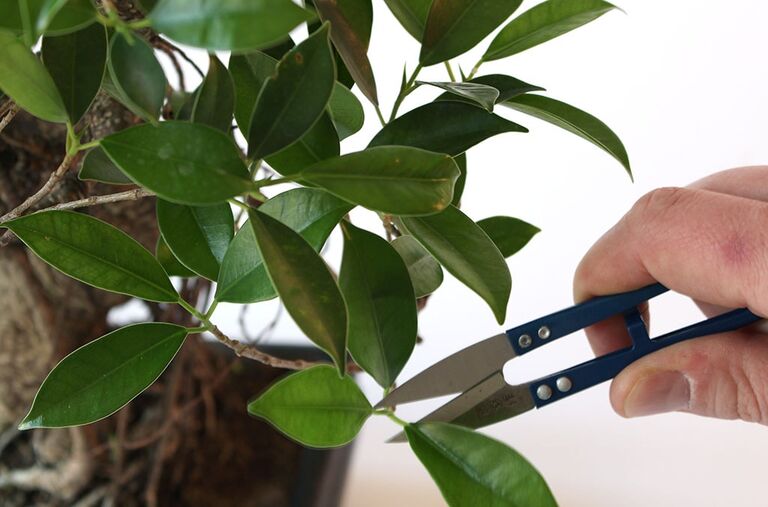 Cut the leaves using a twig shears, leaving the leaf-stalk intact. Using the right Bonsai tools, like a leaf cutter, will help significantly. Check the step by step guide below for detailed information.