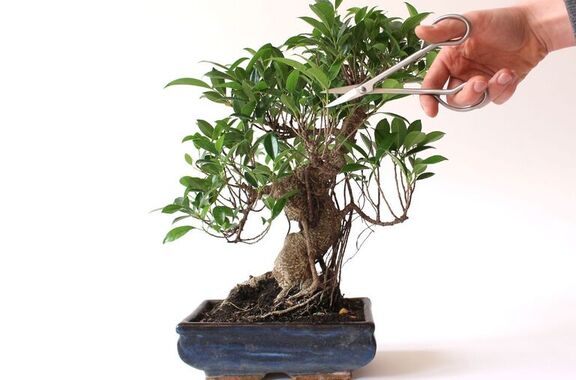 Maintenance pruning a Ficus Bonsai. We maintain the shape of this tree by pruning regularly, which will also result in finer growth and a dense canopy.