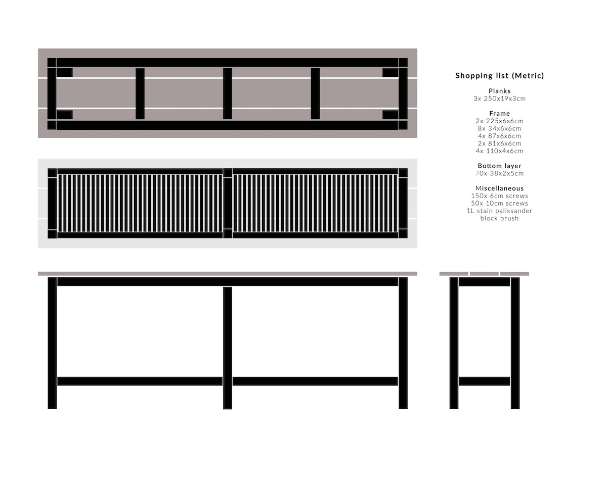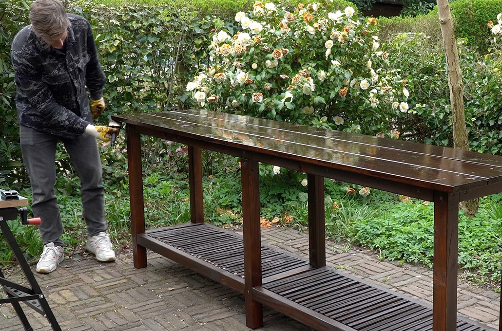 Some of the supplies and tools you need include screws with anti-rust coating, drills, bits, etc. Check the plans below for all info. After sawing and sanding, the first layer of stain was applied. We used Douglas fir wood, with a Rosewood stain. Applying stain is very important to increase the lifespan of the wood. We applied two layers of stain on the wood before assembling, and one final layer after assembling. I expect I'll need to restain once every five years. The frame is being assembled. Its important to pre-drill all holes, to make sure the wood doesn't crack when attaching it with the big screws. For stability the table needs a lower level. Our lower level is a bit complex, but this looks very nice and allows us to store pots and show accent plants with a bit of shade from the upper level. Once assembled, we apply a last (thirds) layer of stain.