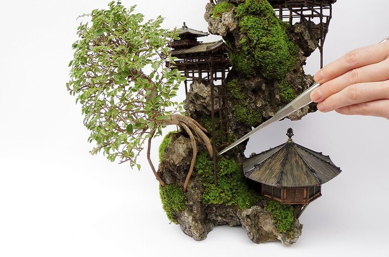 Trees clinging to a steep cliff, roots entangled in solid rock and beautifully detailed miniature buildings - welcome to the mysterious world of "Cliff Bonsai".