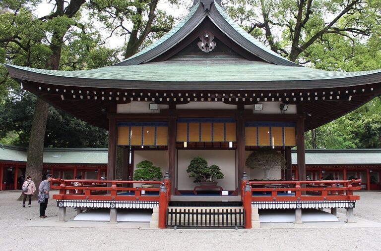 The masterpiece Bonsai trees are displayed spaciously and very orderly, giving visitors the opportunity to appreciate the trees from all sides. From the entrance of the museum you enter the garden through a gallery of Bonsai and walking into two famous and very large pine trees.