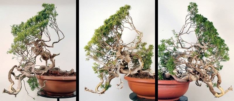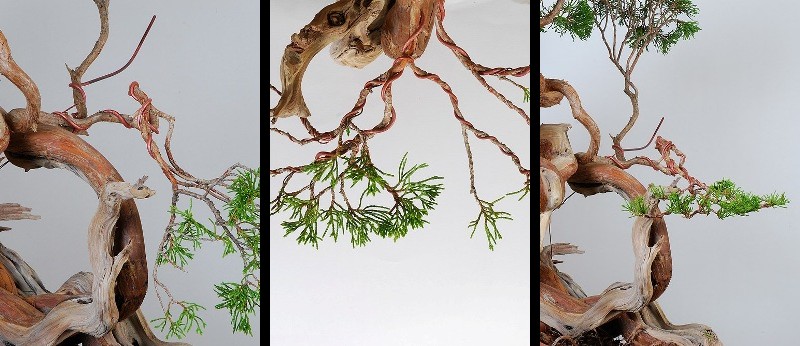 The ability Sabina Juniper Bonsai trees have to withstand heavy bending procedures is quite astonishing. After all, it's part of their nature. If they weren't flexible enough and capable of withstanding heavy snow winds, they would succumb to their surroundings. The fact that they have the ability to tolerate such procedures does not mean that we should always test their limits. Because of this and after establishing the main trunk structure, the tree was left untouched to recuperate for one growing season. Once the tree was allowed to recover, we performed the first styling of branches and foliar masses.