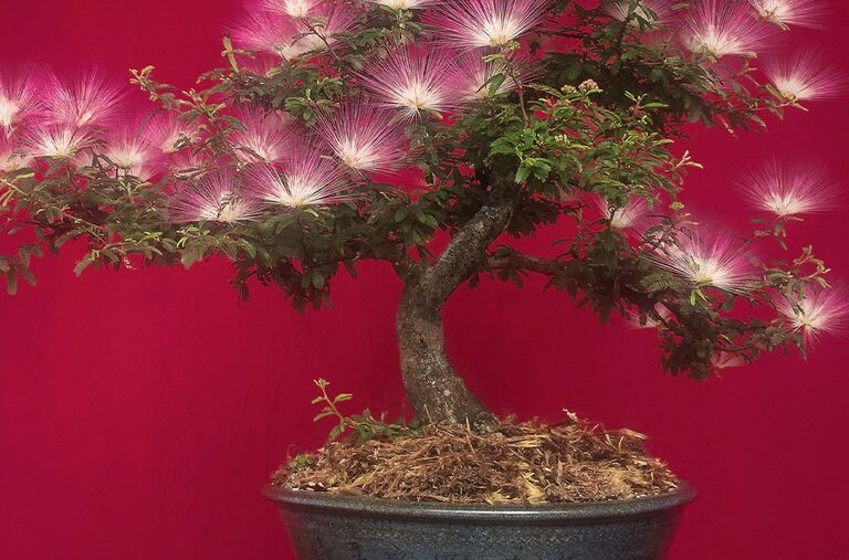 The pink fragrant flower puffs with their silky filiform stamens have given the tree its popular name. The flowering period lasts from April to July. Most Albizia species are not frost-hardy, but tall mature Albizia julibrissin trees planted in gardens can survive some frost and will regrow damaged branches. Because of their strong growth and large leaves silk trees are normally used to create medium or larger sized bonsai. Albizia julibrissin is the most common silk tree for bonsai purposes. The Calliandra is quite similar to the Mimosa bonsai, and sometimes mistaken as the Acacia dealbata (the silver wattle or blue wattle). If you need help identifying your tree, take a look at our Bonsai tree identification guide.