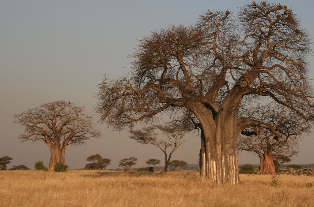 The grey-brown bark is between five and ten centimeters thick and can protect the tree from minor bush fires. The branches are strong and clunky and carry a wide canopy. Without leaves, the crown looks like a root system which has contributed to the legend that the devil has planted the baobab tree upside down. Baobabs drop their leaves periodically and produce new foliage shortly before the start of the rainy season. First simple elliptic leaves appear and after a short time they fall off again, followed by hand-shaped leaves with 5 to 9 leaflets. Older trees can produce large white flowers which hang from the branches on long stalks. The flowers have an unpleasant smell. Baobab fruits are edible.