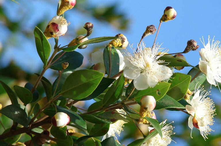 You will find myrtle plants in many nurseries and flower shops. The ancient Greeks and Romans associated this plant with love and virginity and for this reason myrtle twigs with the delicate white flowers are often used for wedding bouquets and bridal wreaths. The leaves are small, lanceolate and dark green. The small white fragrant flowers appear in late summer, followed by pea sized bluish black fruit which contain up to 30 seeds. The fruit are edible and can be used for making liqueur. Myrtles like warmth and need a long warm summer to produce flowers. The trunk thickens slowly and has a cinnamon colored bark that becomes lightly furrowed with age. The myrtle's rootball needs to be kept constantly moist (but not soaking!) and the plant does not tolerate frost. The common myrtle is suited for many bonsai styles, especially for the broom-style. If you need help identifying your tree, take a look at our Bonsai tree identification guide.
