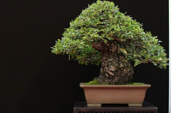 The European Oak (Quercus robur) and the American White Oak (Quercus alba), as well as the Holm oak or holly oak (Quercus ilex), are quite similar in appearance and characteristics. The Cork oak (Quercus suber) is another species which is quite popular. Both are deciduous and frost hardy. Mature trees can become up to 40 meters (130ft) tall and 800 years old. The mighty trunks can reach a diameter of 4' (120cm). Oak wood is used for the construction of buildings, ships, tools and furniture since ancient times. Many wild animals eat the acorns. The heavy branches of the trees bend outwards and develop a characteristic zigzagging line. The crown gets wide in old age. The lobed leaves are about 6" (15cm) long, dark green and turn yellow and brown in autumn. Many southern and Mediterranean oaks are evergreen and not frost hardy, some are smaller trees or even shrubs. Oaks are very well suited for bonsai and easy to care for, but even the frost tolerant species need winter protection when they are planted in containers. If you need help identifying your tree, take a look at our Bonsai tree identification guide.