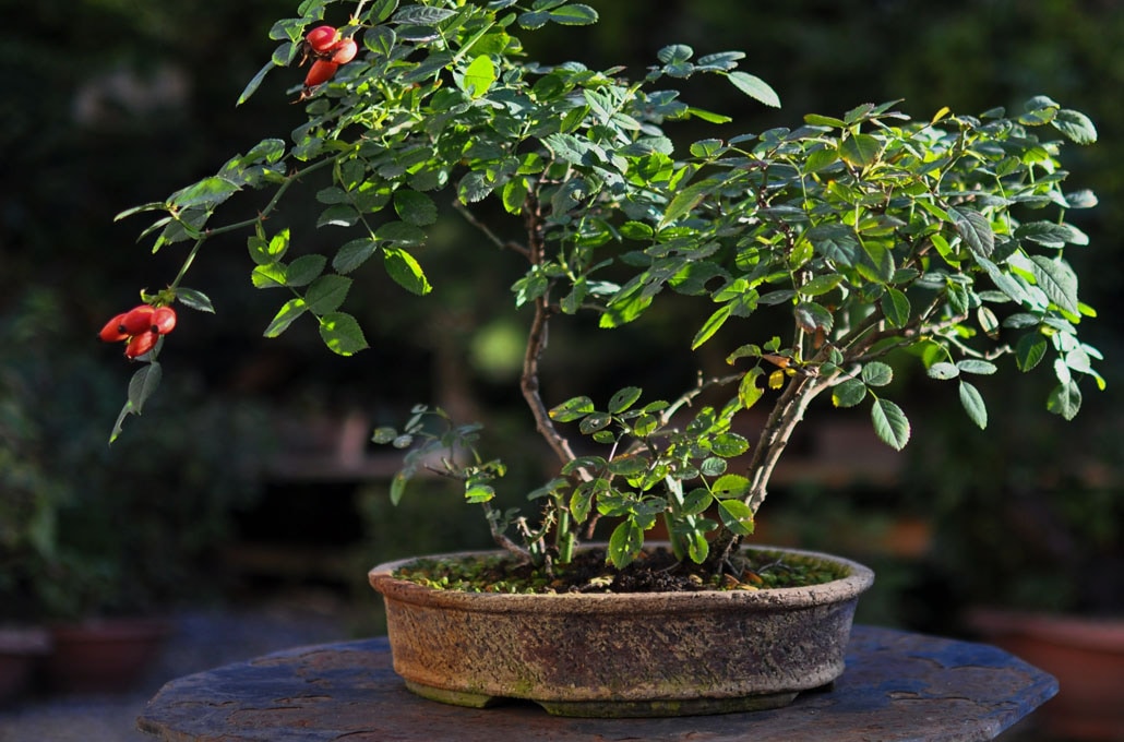 Although roses are normally small deciduous shrubs they can become nice bonsai trees with old trunks and rough bark. They have compound leaves and sharp spines. The first flowers appear in spring and some species can continue flowering until freezing temperatures in autumn make the plants go dormant. After a flower has wilted, the characteristic decorative fruit, the rose hip, develops. For bonsai, the wild roses or dwarf cultivars are best suited, with their smaller flowers and leaves and more delicate twigs and ramification. A few popular species include the rambling rose (Rosa banksiae alba), Rosa multiflora, Rosa Komachi and Rosa canina. If you need help identifying your tree, take a look at our Bonsai tree identification guide.